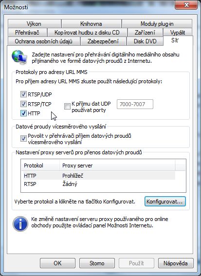" Program WMP nemůže přehrát soubor, protože zadaný protokol není podporován. Pokud jste v dialogovém okně Otevřít adresu URL zadali adresu URL, zkuste použít jiný transportní protokol" .