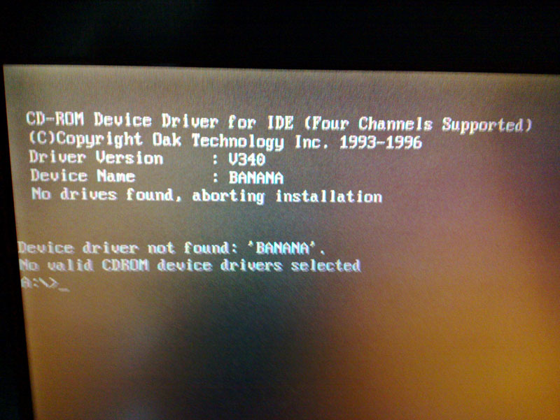 Notebook nemá CD mechaniku a v té disketě je obsažený prý rovnou ovladač CD mechaniky. Proto dostávám po zapnutí počítače hlášku banana na fotce. Jak mám pokračovat? Jak mechaniku zakázat? Překvapivě nejde ani přejít na C: (nebo v tomto stádiu mount disků ještě neproběhl)?