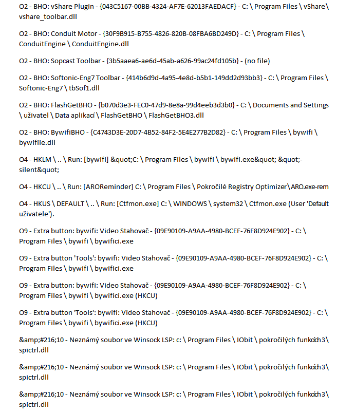 chci se zeptat jestli aktualizuješ třeba ten Spybot před skenem.Podívám se ještě po lepším.Adware a Spybot jsou z jednich nejhorších programů.Ten ESET NOD32 Antivirus je taky na prt jak koukám na ten log,nainstalovat security_essentials nahradí tak tvůj Antivir,Spybot a Adaware je to silnější prográmek.Jinak Advaced System Care má třeba jednu nevýhodu,že detekuje Real Player na internetu a pak nemůžeš stahovat videa,to je jenom proto,kdyby si se divil proč třeba real nefachčí.Tak že všechny tyto tři programy bych odinstaloval Antivir,Spybot a Ad-Avare.Pak bych naistaloval
