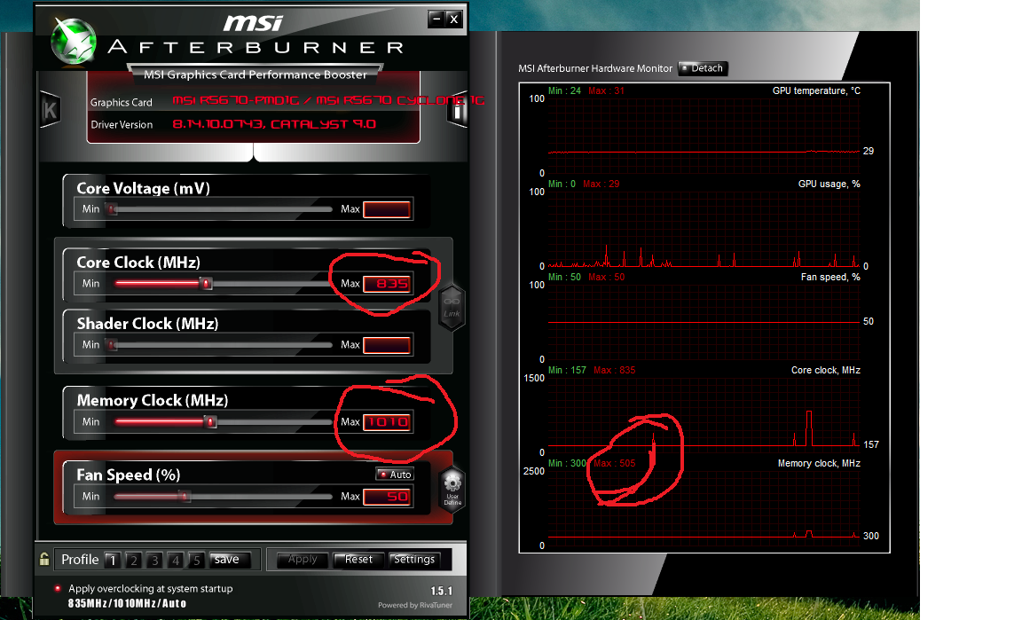 Čau,nedávno jsem si koupil novou grafickou kartu MSI R5670 Cyclone 1G a mám s ní problém,že v programu "MSI Afterburner" se mi zobrazuje full load 505 MHZ paměť!!! měla by být 1010 (e.frekvence 4040Mhz).