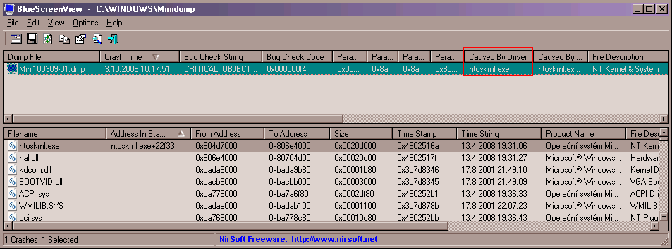 v horním okně vidíš nalezené dump soubory z různých pádů systému, jsou v adresáři C:\WINDOWS\Minidump.