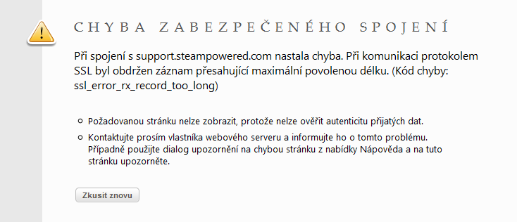 Dobrý den, někdo mi změnil heslo na Steamu, a tak se snažím napsat na Steam Support - support.steampowered.com. Bohužel se mi ukáže buď chybová hláška - v případě načtení adresy s https:// (viz příloha) nebo se nenačte vůbec nic - zadání klasického http:// (bílá plocha). Zkoušel jsem to ve FF, Chrome, IE, Opeře - ani v jednom nefunguje.