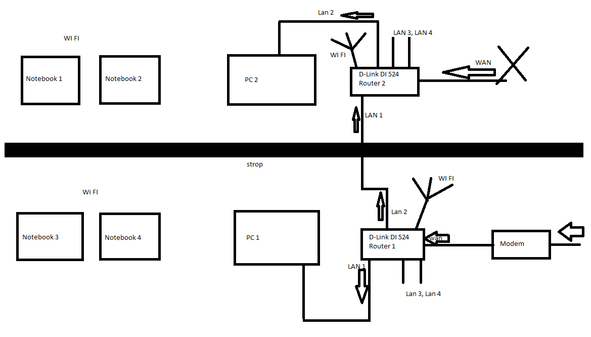Momentálně používám jen jeden, ale chtěl bych je mít zapojené oba, aby se zvýšil dosah mé wifi sítě,jeden bude hned za modemem napojený na PC a vysílat wifi 1 ve spodním patře a z něho by měl být napojen druhý v horním patře který bude napojen na druhé PC a další dva Notebooky pomocí Wifi, chci vědět jestli schéma které přikládám je dobré, nebo by z prvního modemu měl jít do druhého kabel pomocí wan portu, taky mě zajímá jakým způsobem mám routery nastsvit (DHCP, WAN, LAN, atd.....)
