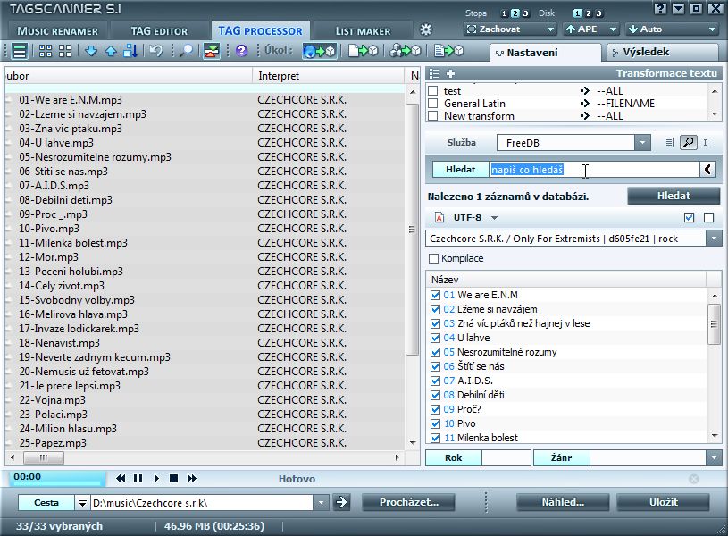 Nahoře lišta tag procesor/vpravo je pak služba s kolonkou a tam dáš FreeBD/označíš všechnu hudbu a dáš hledat,to je kousek od toho/uložíš a dáš náhled ať se podíváš na výsledek.