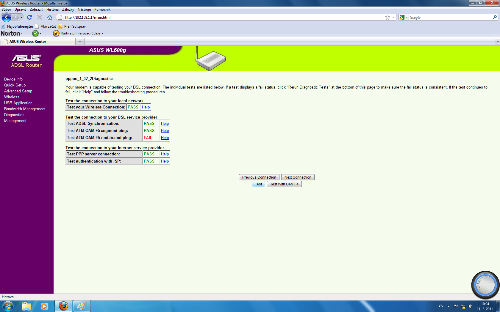kupil som si ASUS WL-600g All-in-1 Wireless ADSL2/2+ Home Gateway. Nainstaloval som ho cez Mozilu, dal som prihlasovacie udaje zo zakaznickej linky od T-comu aj s osobnym loginom, na modeme svietia vsetky kontrolky, ktore maju podla navodu svietit na zeleno a ono to nejde. Ked dam detekovat pripojenie a modem, tak mi to vyhodi nasledovnu stranku /vid priloha/. Co som neurobil ako som mal, alebo treba reklamovat? Trapim sa stym uz tyzden. Sto krat som to restartoval a opatovne zadaval prihlasovacie udaje a nejde a nejde. Cez stary X rocny modem sa prihlasim v pohode , takze chyba je budto v mojich zlych nastaveniach modemu, o ktorych neviem, alebo v technicka/mechanicka chyba modemu.
