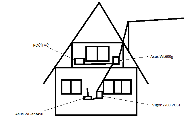 chcel by som signalom Wifi pokryt cely dom a aj vonku zahradu a okolie domu. Mam po ruke toto prislusenstvo: Asus WL600g, Vigor 2700VGST a antenu Asus WL-ANT150. Na obrazku je schema zapojenia ako si myslim, ze by to mohlo fungovat. Na poskchodi by pokryval signalom router Asus a dolu na prizemi by bol Vigor ako Acces Point s tou vykonnejsou antenou od Asusu, aby to zasiahlo aj vonkajsie priestory. Mylim si, ze takto by to mohlo fungovat, ibaze som nieco taketo nikdy nerobil a neviem ako to mam prepojit a ponadstavovat, aby to islo k mojej spokojnosti.