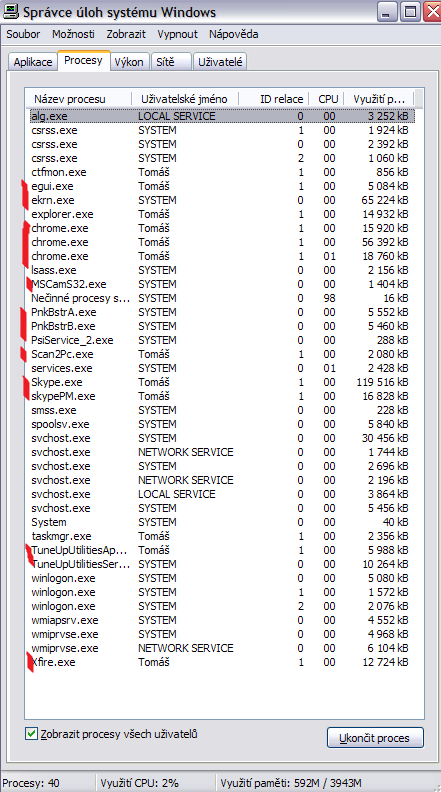 Než vypínat procesy, tož to si raději pusť msconfig a v záložce Po spuštění vypni kraviny, který se pouštět nemusí. Namátkou třeba TuneUp, to se po startu vůbec spouštět nemusí, dále ten PunkBuster, či co to je.