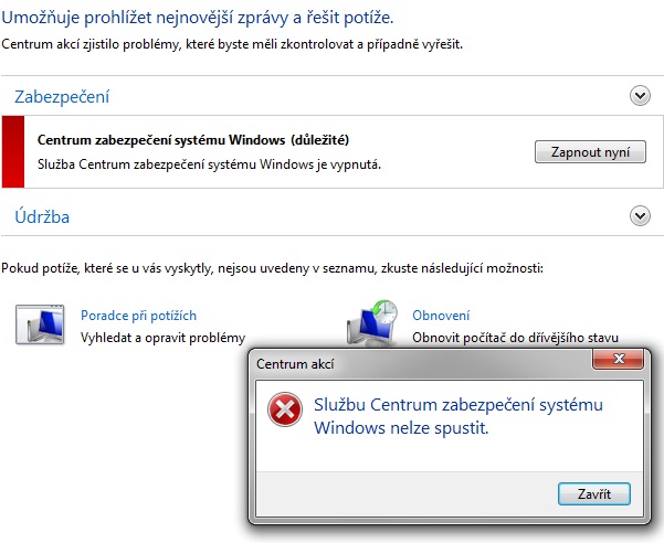 po změnách v ragistrech jak tam píšou.http://www.stealthsettings.com/cs/error-fixed-wind ows-security-center-service-cant-be-started.html