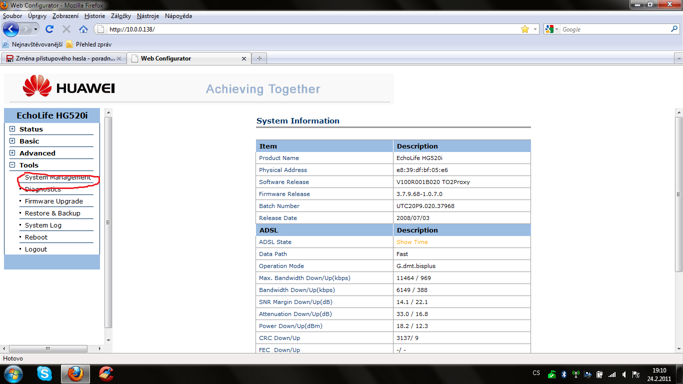 | Poradím ti mám tento modem stejný.Takže přihlaš se do routeru 10.0.0.138 zde.Vlevo v nabídce klikni… metinator 24.02.2011 19:12 |