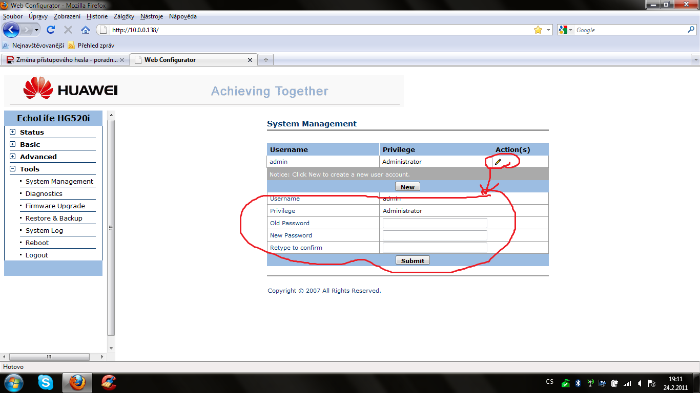 Retype to confirm napíšeš staré heslo nové a dáš Sumbit.Modem se odhlásí a přihlásíš s euž s novým heslem