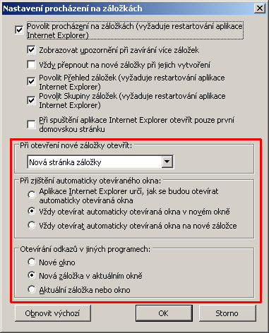 IE v podstatě nepoužívám, ale nějaké nastavení otvírání oken je v tomto menu (Nástroje - Možnosti - Obecné - Záložky /Nastavení/).