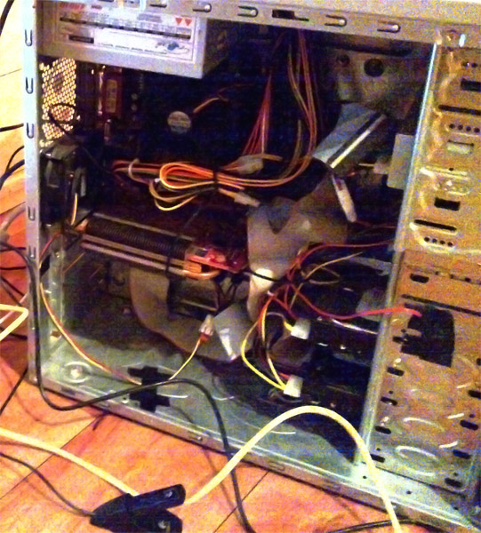 edit: Tak kdyby někdo z vás potřeboval ukázat, že pořádek ve skříni pomáhá proudění vzduchu, tak v tomhle se ten Prescott opravdu uchladit nedal, dokonce mi 2* v létě padnul kvůli tepelné pojistce. (Omlouvám se za foto, je to výřez focený před půl rokem mobilem na LAN party. Od tý doby jsem tam každý týden něco málo ubral. A zdroj je už taky pryč.)