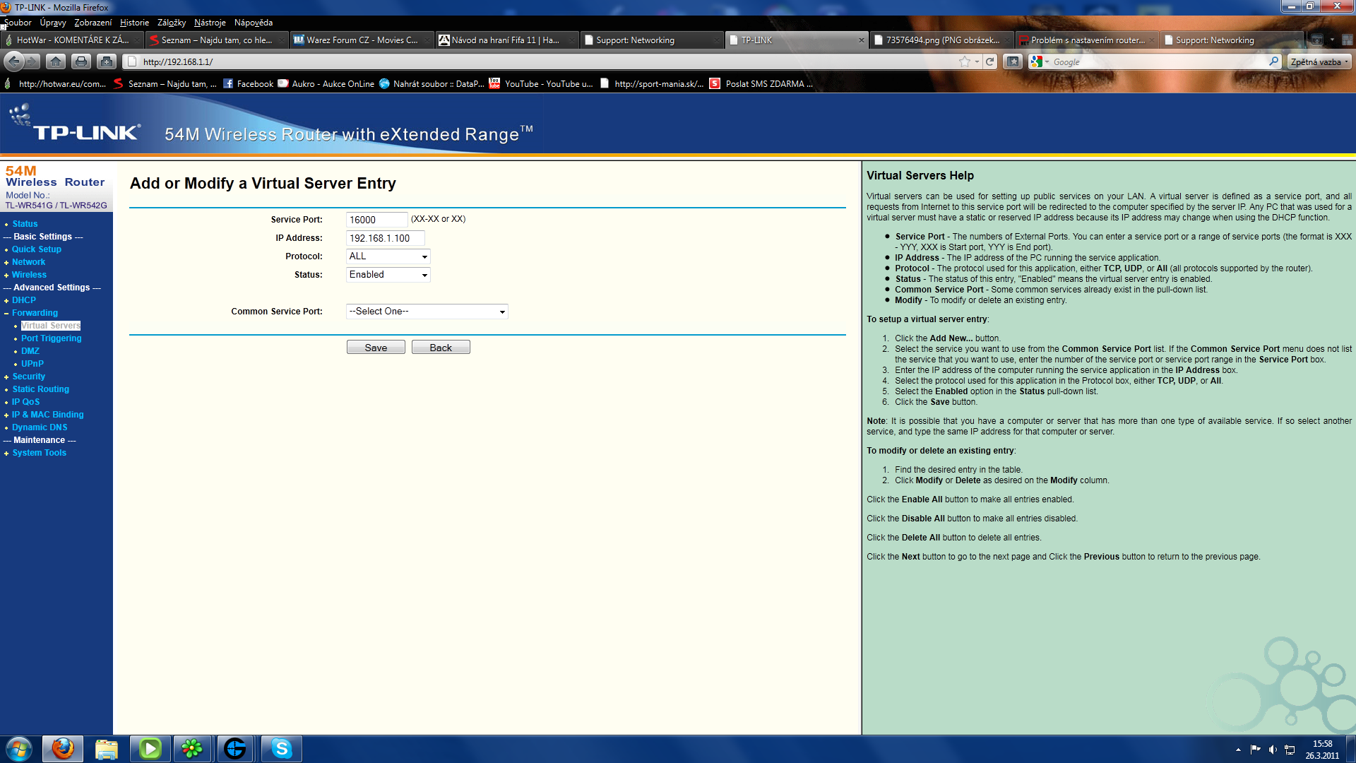 A po tom jak nastavis tam ten virtual server tak klikni na Save. A skus vypnut - zapnut router. Ked nic tak skus aj uPNP, ked ani to nic tak tvoj provider ma dalsi router, budes muset ho kontaktovat ze chces verejnu IP (ak to vobec vie zabezpecit) alebo aspon port forwarding.