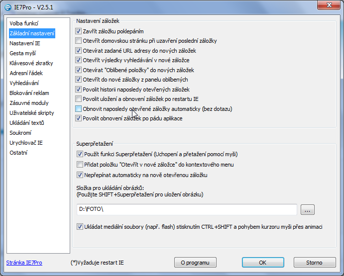 doplňky: povolit grab and drag, preferences, a bho- restartni ie nový