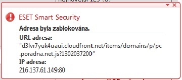 poslední dobou mi pořád dokola vyskakuje hlášení od esetu adresa blokována, dělá to pořád ať navštívim jakýkoli web, v příloze dávám snímek že to udělá i když vlezu k vám na poradnu, a vyskočí to na každé stránce i několikrát. V pc mam absolutní čisto, projel sem ho několikrát sasem i nodem a nikde nic, pouze 1x tracking cookie, netuší někdo čim to může být?