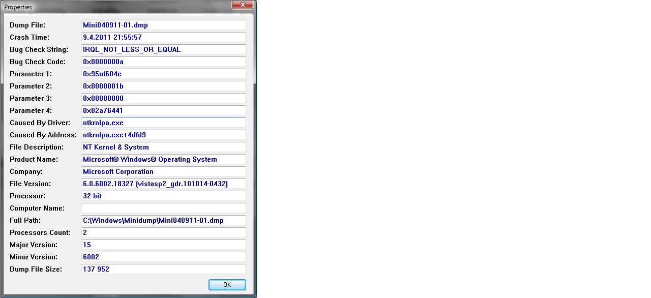 irql_not_less_or_equal ... obvykle znamená hw nekompatibilitu. ntkrnlpa.exe je snad jádro systému.…