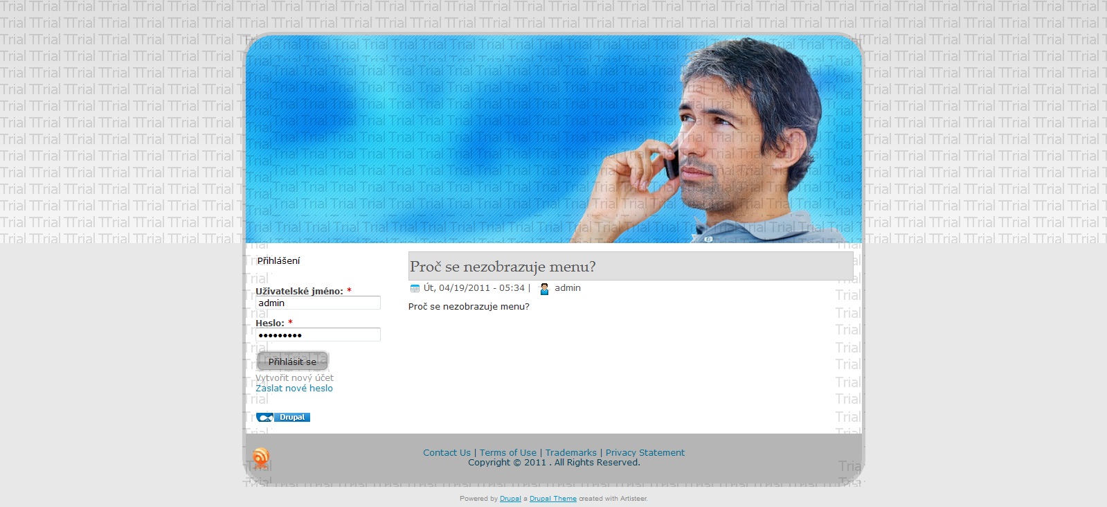 Mas v redakcnim systemu nadefinovane polozky pro menu? Treba se pri jedne polozce ani nezobrazi, bohuzel do logiky drupalu neni snadne videt.
