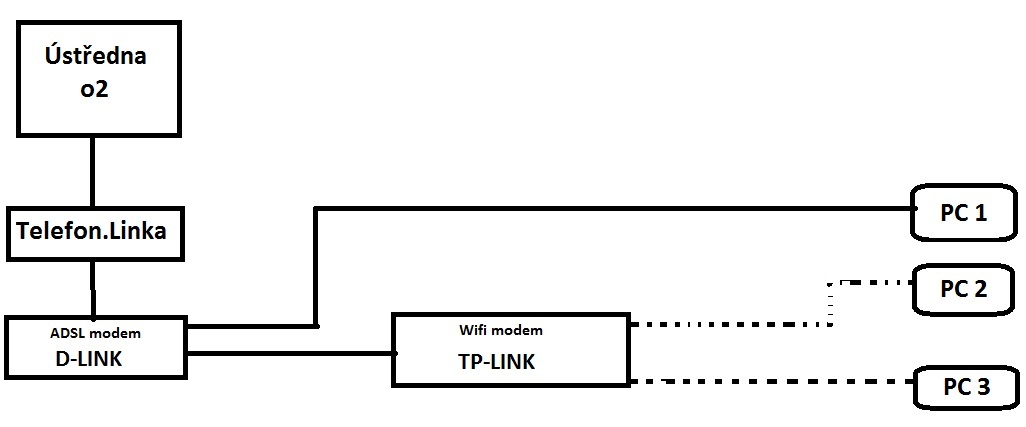 Mám na síti 3 počítače ztoho 2 notebooky.Používám ADSL od o2 telefonica s modemem DSL-584T (pouze 2 ethernet výstupy).Na ten je připojený stolní počítač a druhý wifi modem TL-WR340GD.Přes wifi router se pak připojují notebooky + občas telefon.