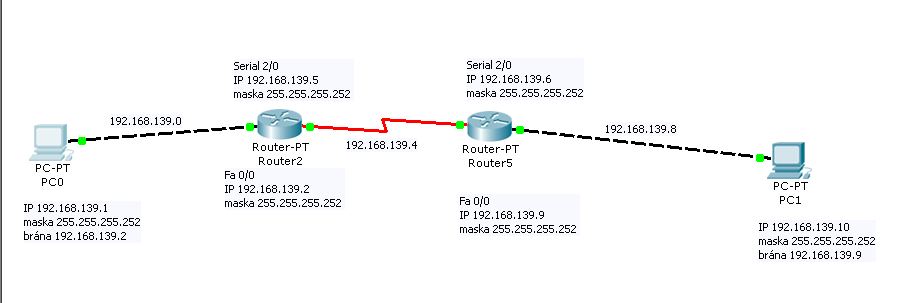 na uvedeném obrázku mám 2 PC mezi sebou propojené dvěma routery. Routery jsou propojené serial dte kabelem. Na routeru 2 mám nastavený clock rate na 64 000. Problém je v tom, že funguje jen ping výchozí brány. Ping druhého PC ani serial portu na routeru nefunguje. Pokud jsem dobře slyšel, na routerech by se mělo nastavit statické routování, ale já nevím jaké adresy do statického routování napsat. Poradí někdo??