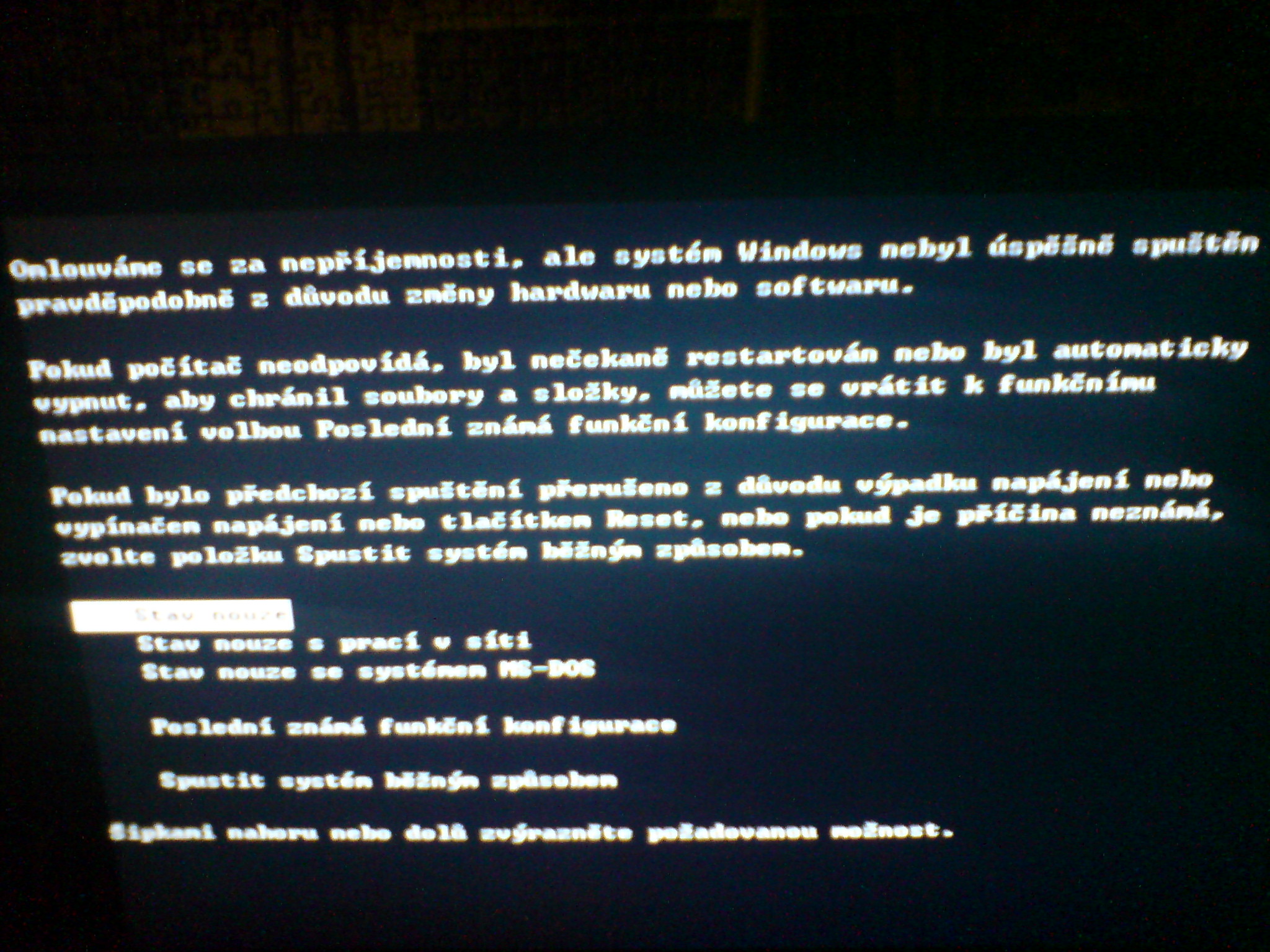 bios správně přesměroval start na disk. zavádí se windows a zjistí neúspěšný poslední start, proto t… poslední