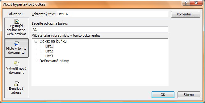 jako "odkaz na" vybereš "místo v tomto dokumentu". Pak stačí miší kliknout na vybraný list (např:List3) a do položky "zobrazený text" napsat jméno (Franta). Tím se ti vytvoří ma listě1 hypertextový odkaz "Franta" na List3.