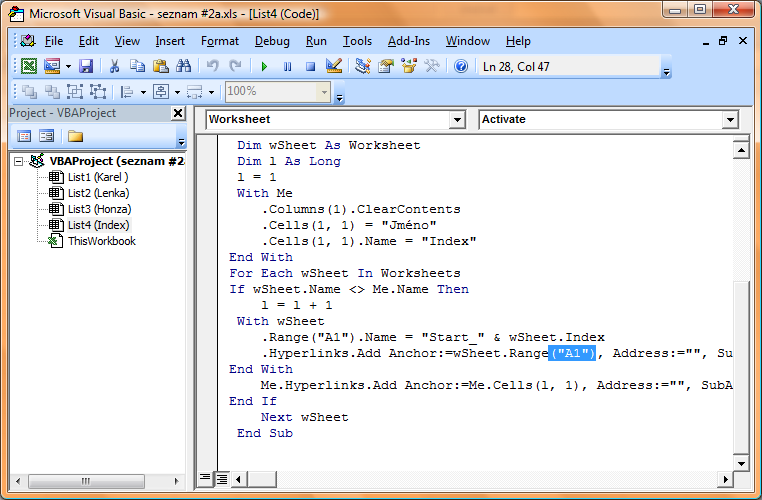 Funguje následovně: když vytvoříš v sešitu nový list (např: Tereza) a přepneš se do listu index, aktivuje se makro a do sloupce A vypíše všechny listy a vytvoří odkazy. Při každé aktivaci listu index dochází k tomu, že makro vymaže stávající "seznam" a vytvoří nový. Tím jev"seznam listů" vždy aktuální.