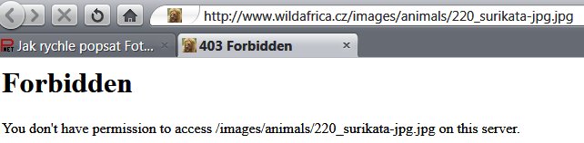Tak co to kdakas o forbidden access? Ta fotka je jak na googlu, tak na mym webu normalne verejne pristupna. Viz treba tady http://www.wildafrica.cz/images/animals/220_surika ta-jpg.jpg ale zmenim ji a odstranim.