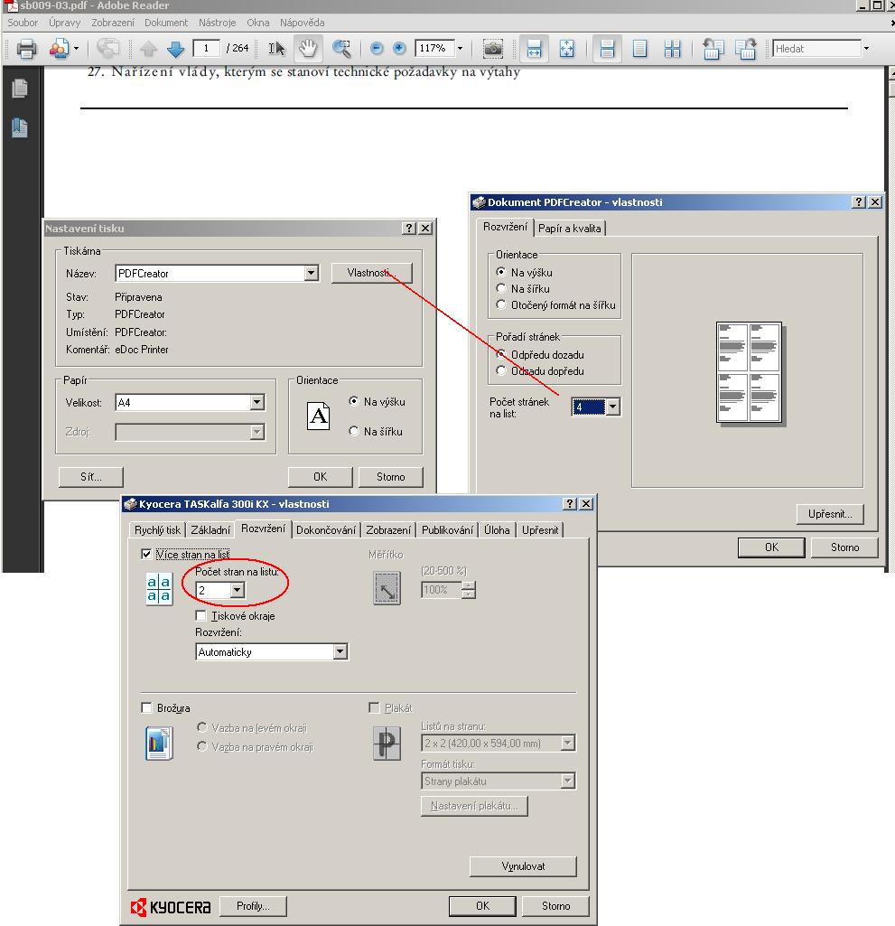 Nastavení tisku víc stran na jeden list je (asi mimo jiné) IMHO věc konkrétní tiskárny. Třeba PDFCreator udělá nové PDF s více stránkami na jeden list, tiskárna vytiskne na jednu stránku A4 víc stran původních.