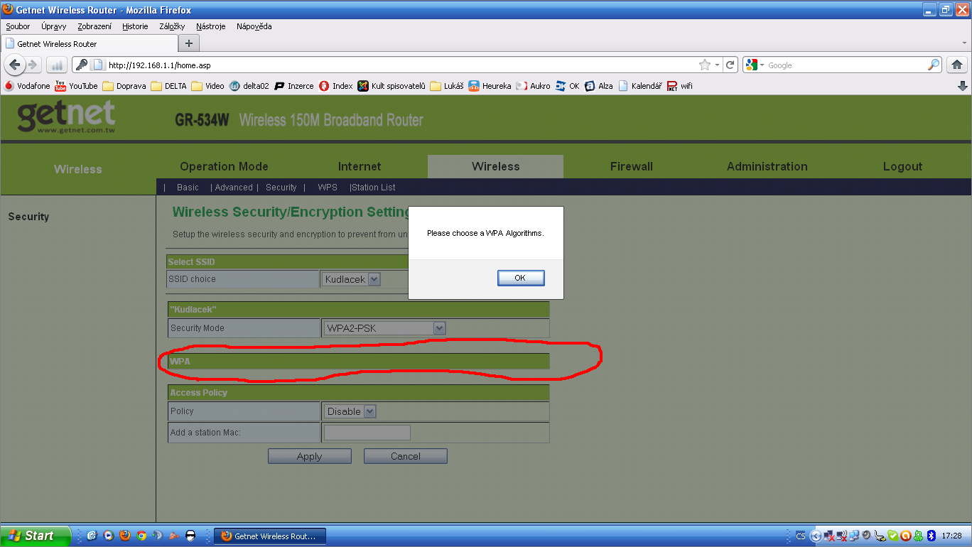 tak mi ho to sice vybere, nezobrazí se šifrování, ale jenom nad tabulka WPA jinak nic