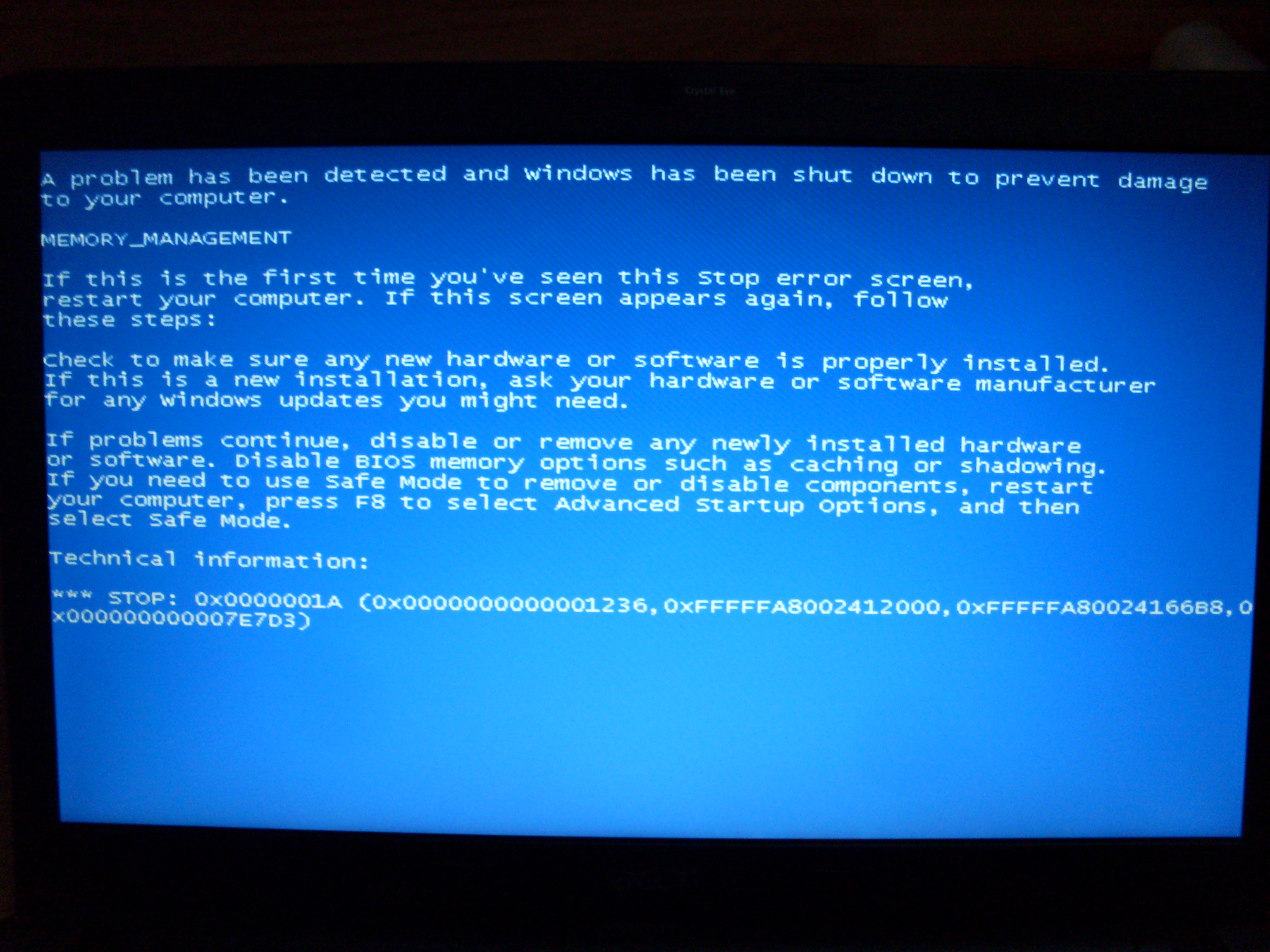 nedávno mi začal na notebooku blbnout windows 7 ... sám od sebe za rastartoval a pokaždé se objevilo modré okno s textem viz obrázek 1 dokonce i nouzovém režimu mi tpo dělalo a včera už ani nenaběhl... když sem chtěl windows přeinstalovat tak mi to nejprve nechtělo naběhnout z CD až z flash-disku se to povedlo ale a při instalování mi to zase spadlo viz obrázek 2 ... nevíte co stím pls poradte ... předem děkuji.