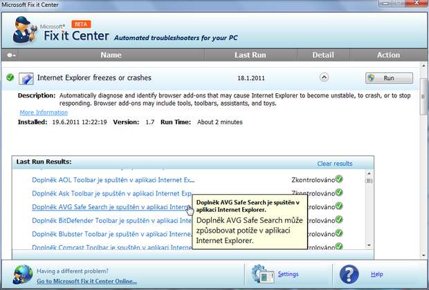 Tak jsem ze stránky na kterou uvádíš odkaz ten Fix it spustil a nechal provést položku "Zakázání problematických doplňků". Nyní uvidím zda se mi ta informace, že IE přestal pracovat ještě bude zobrazovat. To zjistím asi až po delší době.