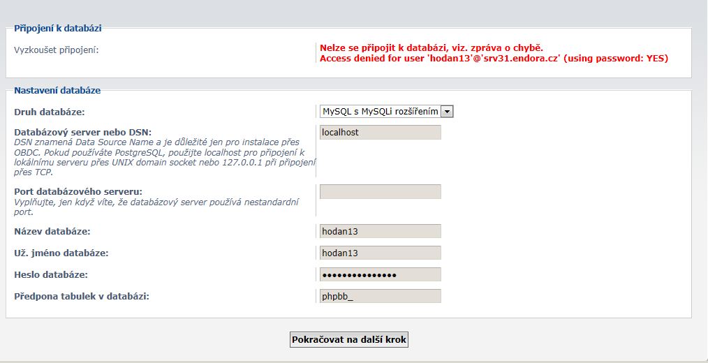 Zdravim, des sem si řekl že si udělám forum - phpbb a už jsem ho párkrát instaloval např na ic.cz atd... ale dneska se mi to nepovedlo. Vůbec nevím teda jak to mam vyplnit viz soubor - - obrázek. Neevím jak to na tomto serveru vyplnit prosím porádíte mi co mam kam dát? sevrer kde sem to instaloval je Endora.cz