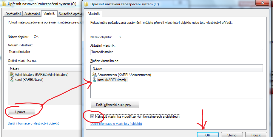 - změnit vlastníka na sebe /na celém disku C:/