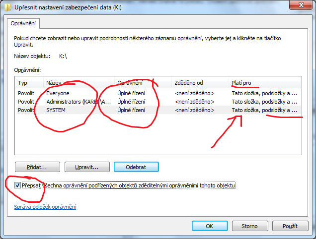 - nastavit práva /příklad z jiného disku ale opět nastavuješ pro celý disk/. Když se budeš snažit adresář po adresáři tak se z toho po.... a nepojede to