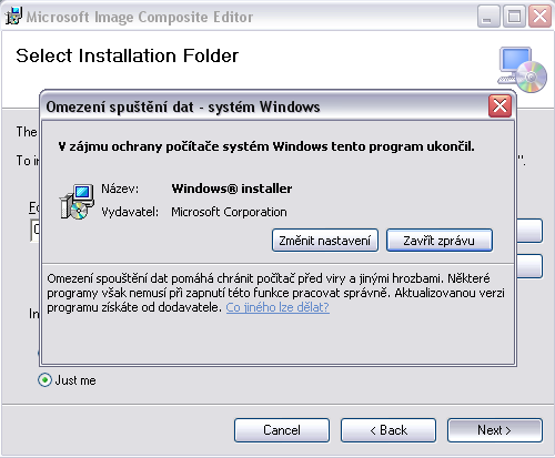 Poté jsem klikl na nápovědu a tam psali, abych jel do: Start > ovládací panely > systém > upřesnit > U výkonu ,,NASTAVENÍ" > Zabránění spuštění dat (DEP) a tam abych udělal to, aby nebylo zakřížkováno právě ono Windows® installer! To jsem udělal. Byl potřebný restart PC pro uložení, nebo by stačilo až při dalším spuštění windows, opět program instalovat a mělo by být vše v pořádku. Ovšem při dalším pokusu po spuštění instalace se to objevilo znovu. Dal jsem proto opět změnit nastavení při oznamující zprávě, sice Windows® installer nebyl už zakřížkován, což je správně, ale teď nevím, co dělat? Vůbec nemohu dokončit instalaci, protože je to nekonečné...