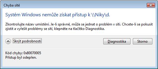 Když to zkouším přes síť ve windows Vista PC dcery se mi zobrazí. Poklepu na něj a zobrazí se mi hláška viz obrázek: Chyba sítě.