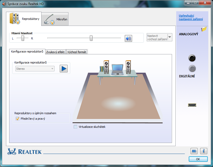 Ve Správci zvuku Realtek HD se prostě zobrazí jenom reproduktory 2.1. (viz. příloha)