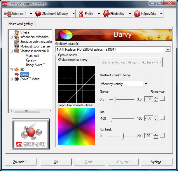 Ach jo, tak klikni na to Catalist Control Center. Pokud se ti objeví základní nastavení, tak klikni na Pokročilé, potom na Barvy a potom si nastav Jas a Gamu podle libosti.