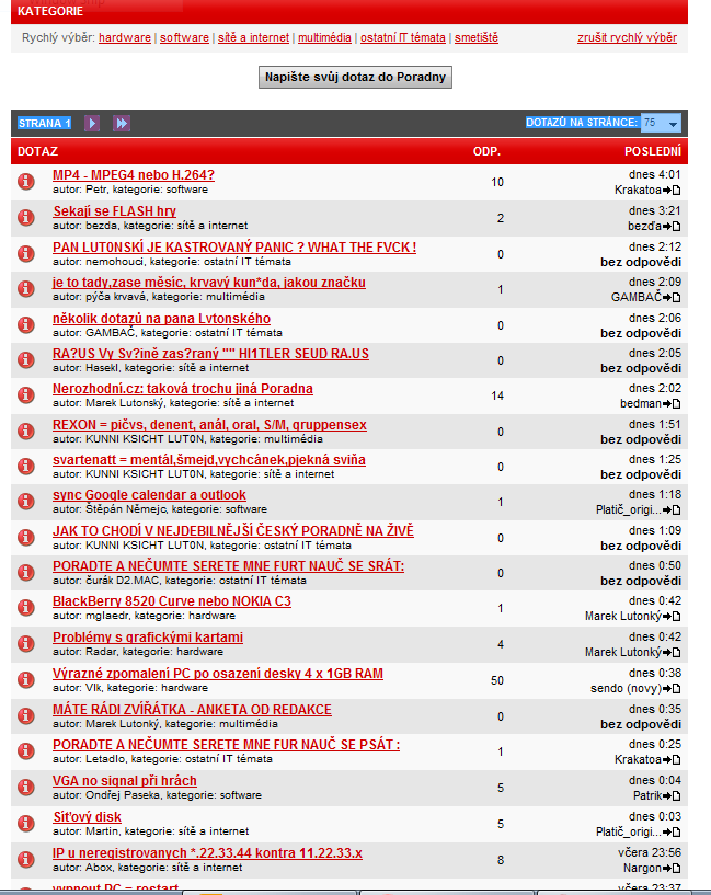 Z nouze jsem tam také pokukoval, ale každé ráno (než se tamní moderátorstvo probudí) to tam vypadalo otřesně. Minimálně polovina threadů typu: "PAN LUT0NSKÍ SE POKUSIL SI HO VYKOUŘIT SÁM SOBĚ:" (dnes 16:01).