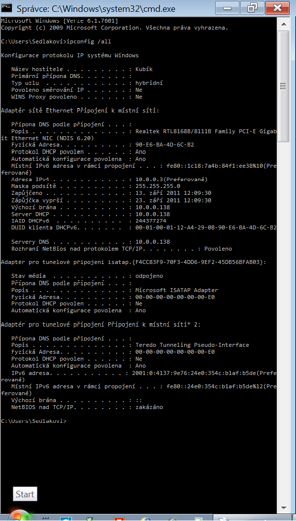Tak screen co ukazuje příkaz "ipconfig /all" máš v příloze
