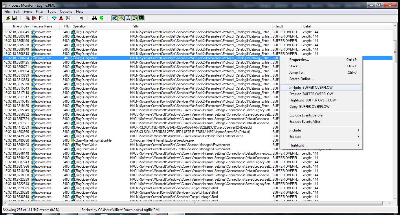 problém začíná, když ie začne komunikovat s tcp/ip stackem a s rozhraním síťovky. tam je problém. v logu není ani událost typu přístup zakázán. jsou tam řetězovky typu BUFFER OVERFLOW