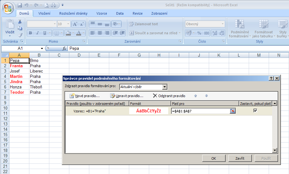 prosím o pomoc. Mám dva sloupce v Excelu.. jeden se jmény zaměstnanců a druhý s městy, kde bydlí (Praha,Brno,Pardubice) a potřebuji naformátovat jména tak, aby se ty jména zaměstnanců, kteří bydlí v Praze zabarvila červeně.