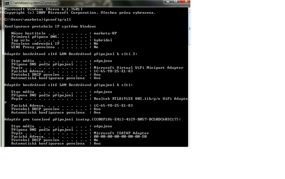 Spusť cmd, do otevřeného okna napiš příkaz: ipconfig /all a zkopíruje sem, co ti vyjede.