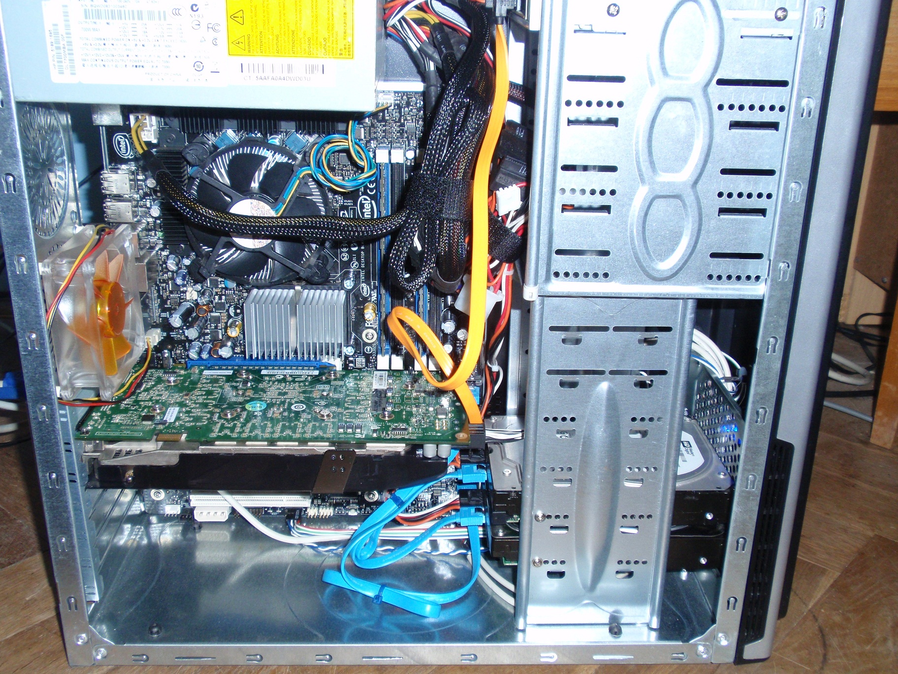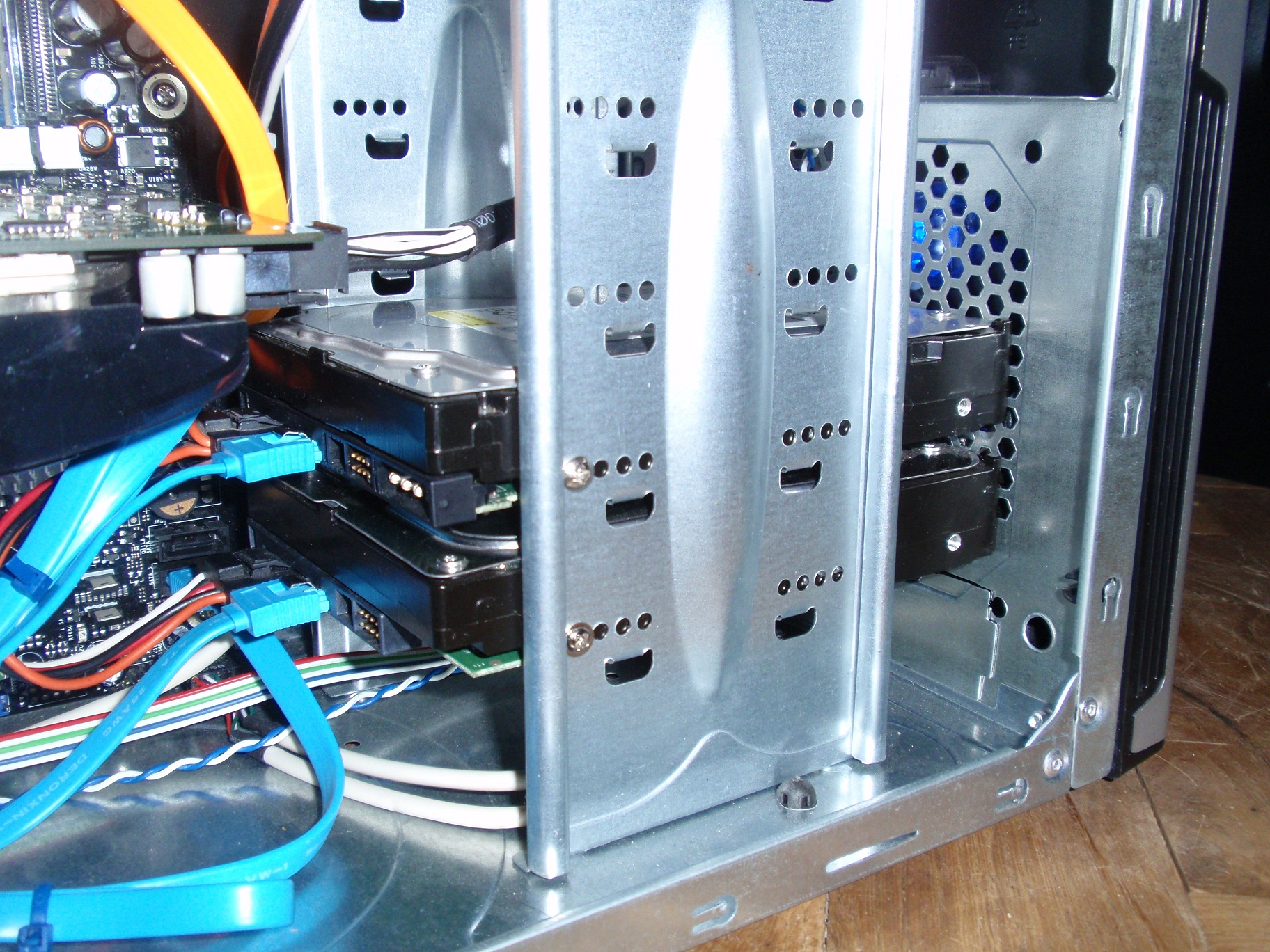 Len pre inspiraciu. Obrazok 1 je tvoja doska. Mozes prepojit tie HDD, ako som ti to nakreslil tymi sipkami. Dva modre kabliky do tych prvych hornych na doske a to tak, ze ten co mas na nom system bude lepsie dat do vrchneho. Orange kablik od DVD do hociktoreho ineho tak, aby nezavadzal ked budes posuvat HDD sposobom ako je na obrazku 2. HDD bude zrejme prisrobovane aj zo zadu, tak treba odmontovat aj tu druhu bocnicu, aby si sa k tomu srobiku dopracoval. Systemovy disk by som dal tam dole pred ten vetrak 120, pojde asi castejsie ako ten druhy, tak bude lepsie ak bude ofukovany. Ked budes mat tie HDD vybrate, tak tam narves aj ten vetrak. Pouzijes tie gumove uchyty co budu k tomu vetraku a ked das prec ten predny plast tak ich iba vytiahnes a ono sa to zacvakne. Ak by ti prekazala ta grafika, da sa dat aj do toho druheho modreho slotu bez ubytku vykonu, aj ked by som ju nechal v tom hornom. Takze vidis, ze ked budes trocha kreativny, tak aj z tejto hroznej srine sa da spravit nieco v com sa nebudu tie komponenty varit.