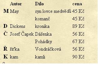 Zdravím, potřebuji nakopnout. Známý chce udělat seznam knih do antikvariátu, na www stránce by měl vypadat jako na obrázku. Z hlediska jednoduchosti zapisuji knihy v Excelu 2003, výsledek převedu do CSV (text, sloupce oddělené středníkem) protože se snadno pomocí PHP převede na HTML tabulku. Ovšem má to své mouchy, pokud si bude chtít nechat v excelu nějaký prázdný řádek pro pozdější doplnění, PHP hodí chybu (když chybí středníky) nebo prostě vytvoří v tabulce prázdný řádek ,což na stránce nevypadá dobře.