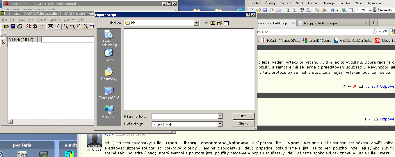 Nějak se motám s tím vymazováním (bod 1 mého dotazu). Dělám to přesně podle tvého návodu : - "ad 1) Zrušení součástky: File - Open - Library - Pozadovana_knihovna. V ní potom File - Export - Script a uložit soubor .scr někam, jenže já tam žádné soubory ".scr" nemám. Přesto když dám uložit, tak mi to něco uloží, ale zase není v čem ten soubor otevřít. V příloze posílám screen. Pokud je to tak složité, necháme to být. Pokud se jedná o nějakou mou chybu a máš chuť, zkus napsat co s tím. Nebo prosím ostatní, není něco jednoduššího, jak se zbavit nepotřebné součástky v knihovně?