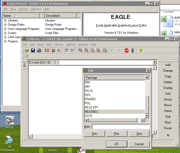 ad 1) Zrušení součástky: File - Open - Library - Pozadovana_knihovna. V ní potom File - Export - Script a uložit soubor .scr někam. Zavřít knihovnu a editovat uložený soubor .scr (textový, čitelný). Tam najít součástku (.dev), případně, pokud jsme si jisti, že to není použito jinde, její symbol (.sym) a stejně tak i pouzdra (.pac). Který symbol a pouzdra jsou použity najdeme v popisu součástky .dev. Až jsme spokojeni,tak znovu v Eagle File - New - Library. Tam klikneme na symbol SCR a vybereme upravený soubor .scr. Pokud jsme mazali příliš aktivně (třeba pouzdro, které je potřeba), tak vznikne chyba a je třeba postup (s větší opatrností) opakovat. Proto editujte kopii .scr, ať nemusíte pořád exportovat z knihovny. Toto knihovnou přepište původní knihovnu.