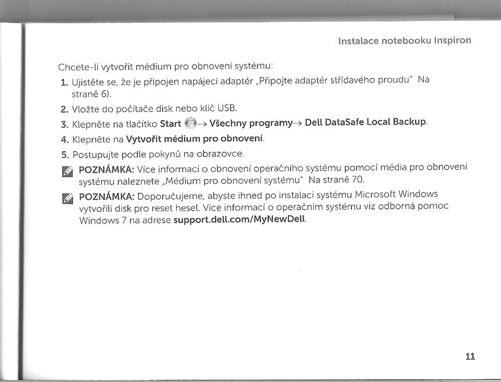 obnova a zaloha je popisana v navode. Vlastne zalohy si mozes robit aj samotnym Windows alebo v nejakom dell software predinstalovanom ak v tvojom modeli je predinstalovany, obnova na vyrobny stav sa robi spravidla mackanim spravnej klavesy pri starte notebooku (viz navod) a potom tam navolenim nejakeho factory recovery.