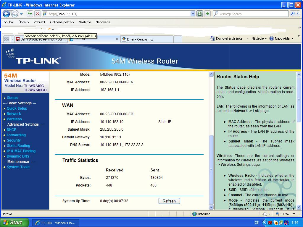 Když zadám adresu 192.168.1.1 do prohlížeče a kliknu na DHCP, pak na DHCP Settings tak tam mám stav ENABLE takže se připojuji asi přes DHCP ale možná že ho mám špatně nastavený, nevím. Mobil mám Nokii N8 ale tam to mám myslím správně nastavené, přidal jsem si přístupový bod na internet svoji WIFI takže když sa pripojím na Internet jde to přes wifi, rovněž i klíč mám nastavený v mobilu takže v poho. To jak píše ked sa pripojíš na tvoju siet znamená to sem myslel na Wifi. Samozřejmě když zruším to zabezpečení a mám otevřenou sít tak se bez problému připojím přes wifi ale když si to zabezpečím tak to jenom najede do prohlížeče ale neotevře se adresa. Nevíš čím by to mohlo být. A nic jiného kromě mobilu nemám. Ani notebook nebo podobně. Moc prosím pomoz:-(