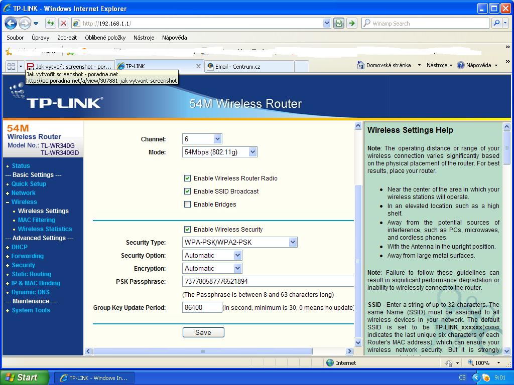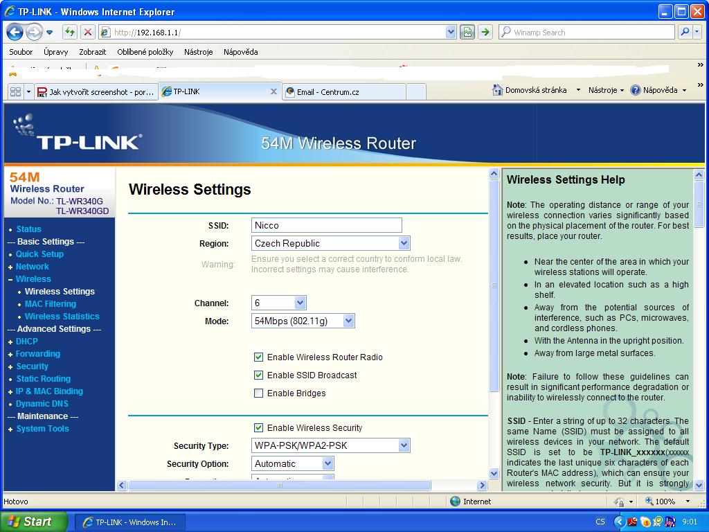 no můžu vám nafotit to nastavení ale nevím jak, všechno to nastavení routeru bych vám nafotil ale nevím jak,dokonce tady bylo i jedno forum že to tady jeden nastavoval ale vy jste mu to zamkly protože si z vás dělal srandu,možná mám blbě nastavené obě dns adresy, mám tam tři zabezpečení. Jedno je WEP to bych nafotil, druhé mám WPA/WPA/2 a mám na výběr z možností WPA nebo WPA2 a pak ke každému TKIP a AES jenže u toho to chce i ip radius server ,to bych vám taky nefotil a třetí šifrování WPA-PSK/WPA2-PSK to taky nejde, tam je taky na výběr bu WPA-PSK nebo WPA2-PSK a rovněž k tomu i TKIP nebo AES ale takhle je to blbé vysvětlovat. Řekněte mi jak to mám nafotit a nafotím vše, snad vám to pomůže mě pomoct.